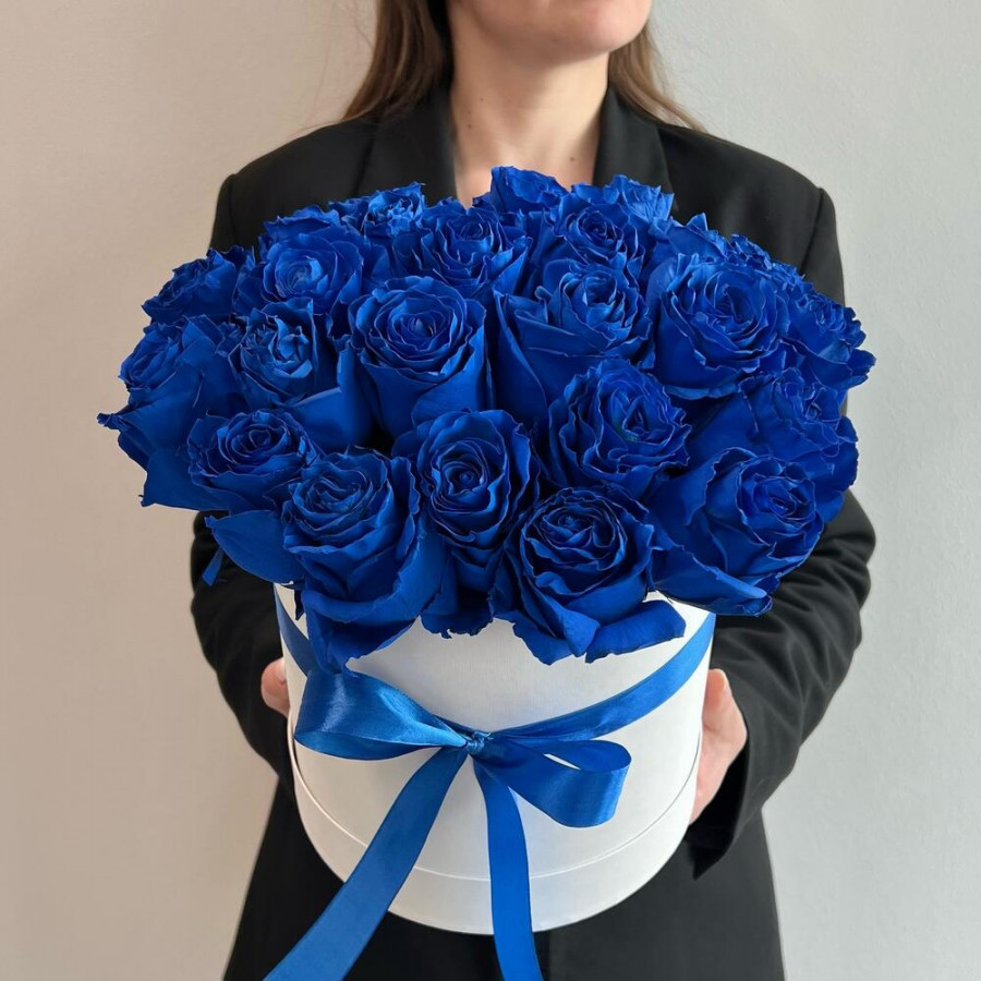 На фото 25 синих роз в коробке. В составе: роза (синяя) 25 шт, оазис флористический 2 шт, коробка (m) 1 шт, атласная лента 1 шт, . Все цветы свежие и ароматные, букет красиво оформлен и отлично подходит для подарка. Доступна доставка цветов или самовывоз.