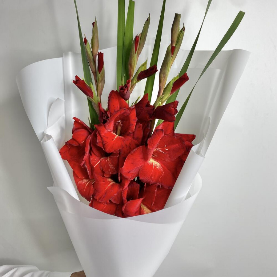 На фото букет из 3 красных гладиолусов. В составе: гладиолус 3 шт, дизайнерская упаковка 2 шт, атласная лента 2 шт, . Все цветы свежие и ароматные, букет красиво оформлен и отлично подходит для подарка. Доступна доставка цветов или самовывоз.