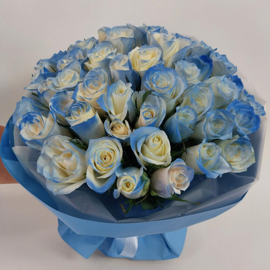 На фото букет из 41 голубой розы. В составе: роза 41 шт, дизайнерская упаковка 1 шт, атласная лента 1 шт, . Все цветы свежие и ароматные, букет красиво оформлен и отлично подходит для подарка. Доступна доставка цветов или самовывоз.