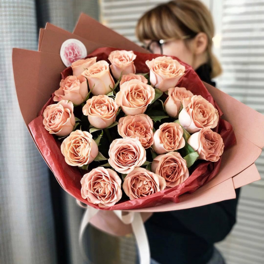 На фото букет из 21 бежевой розы. В составе: роза 21 шт, крафт-бумага 1 шт, атласная лента 1 шт, . Все цветы свежие и ароматные, букет красиво оформлен и отлично подходит для подарка. Доступна доставка цветов или самовывоз.