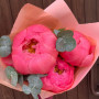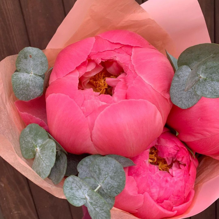На фото букет из 3 коралловых пионов. В составе: пион 3 шт, эвкалипт 1 шт, крафт-бумага 1 шт, атласная лента 1 шт, . Все цветы свежие и ароматные, букет красиво оформлен и отлично подходит для подарка. Доступна доставка цветов или самовывоз.
