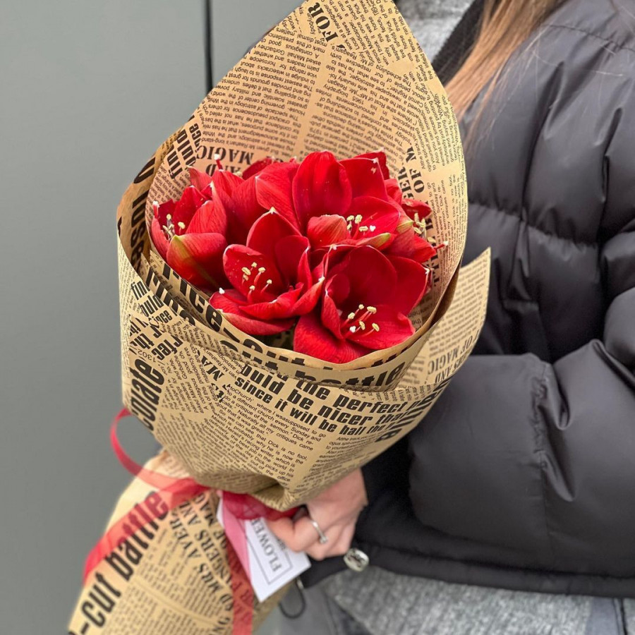 На фото букет из 7 красных амариллисов. В составе: амариллисы 7 шт, крафт-бумага 1 шт, атласная лента 1 шт, . Все цветы свежие и ароматные, букет красиво оформлен и отлично подходит для подарка. Доступна доставка цветов или самовывоз.