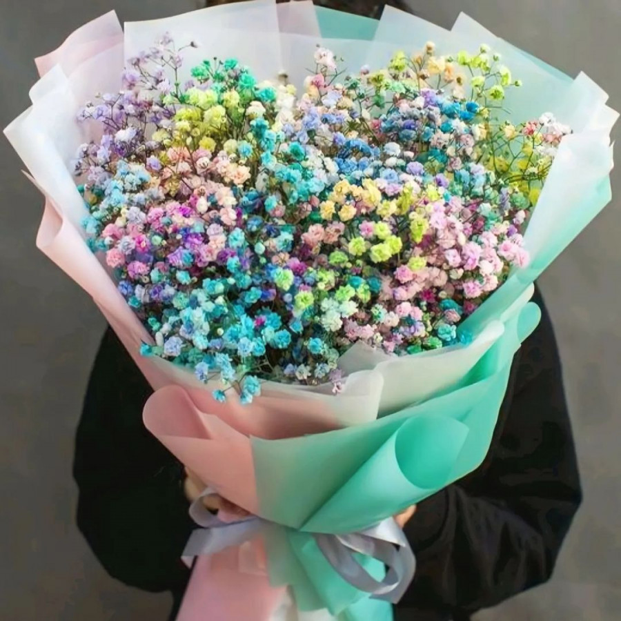 На фото букет из 7 радужных гипсофил. В составе: гипсофила 7 шт, крафт-бумага 1 шт, атласная лента 1 шт, . Все цветы свежие и ароматные, букет красиво оформлен и отлично подходит для подарка. Доступна доставка цветов или самовывоз.