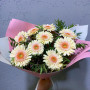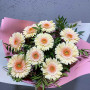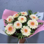 На фото букет из 9 белых гербер. В составе: гербера 9 шт, писташ 2 шт, крафт-бумага 1 шт, атласная лента 1 шт, . Все цветы свежие и ароматные, букет красиво оформлен и отлично подходит для подарка. Доступна доставка цветов или самовывоз.