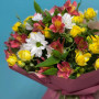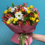На фото букет из белой хризантемы и альстромерии. В составе: хризантема кустовая 1 шт, альстромерия 5 шт, кустовая роза 5 шт, писташ 2 шт, . Все цветы свежие и ароматные, букет красиво оформлен и отлично подходит для подарка. Доступна доставка цветов или самовывоз.