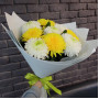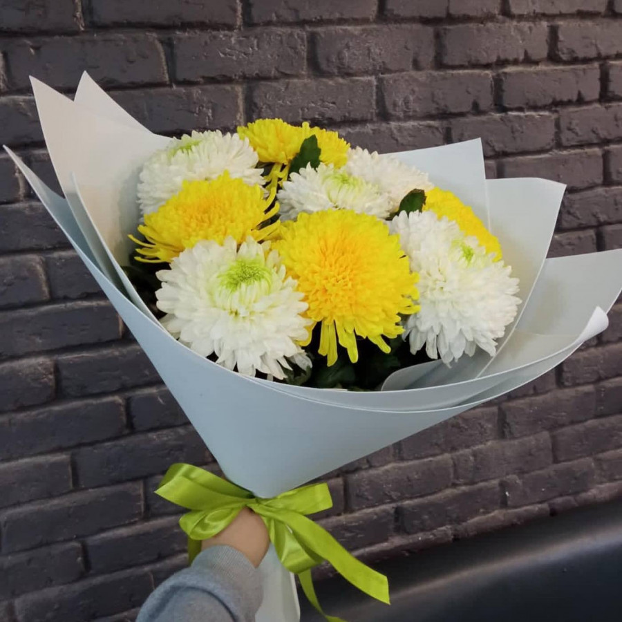 На фото букет из белых и желтых хризантем. В составе: хризантема одноголовая 9 шт, крафт-бумага 1 шт, атласная лента 1 шт, . Все цветы свежие и ароматные, букет красиво оформлен и отлично подходит для подарка. Доступна доставка цветов или самовывоз.
