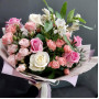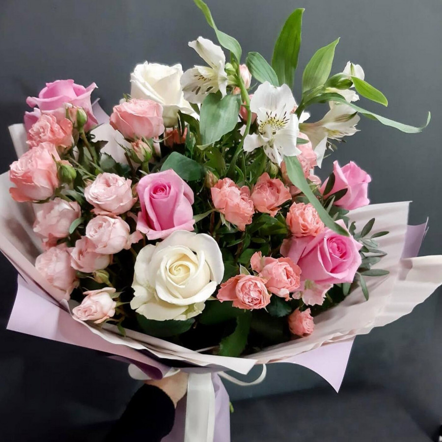 На фото букет из белых роз и альстромерии. В составе: роза 3 шт, кустовая роза 2 шт, альстромерия 2 шт, крафт-бумага 1 шт, атласная лента 1 шт, . Все цветы свежие и ароматные, букет красиво оформлен и отлично подходит для подарка. Доступна доставка цветов или самовывоз.