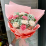 На фото букет из гвоздик и гипсофилы. В составе: гвоздика 15 шт, гипсофила 4 шт, крафт-бумага 1 шт, атласная лента 1 шт, . Все цветы свежие и ароматные, букет красиво оформлен и отлично подходит для подарка. Доступна доставка цветов или самовывоз.