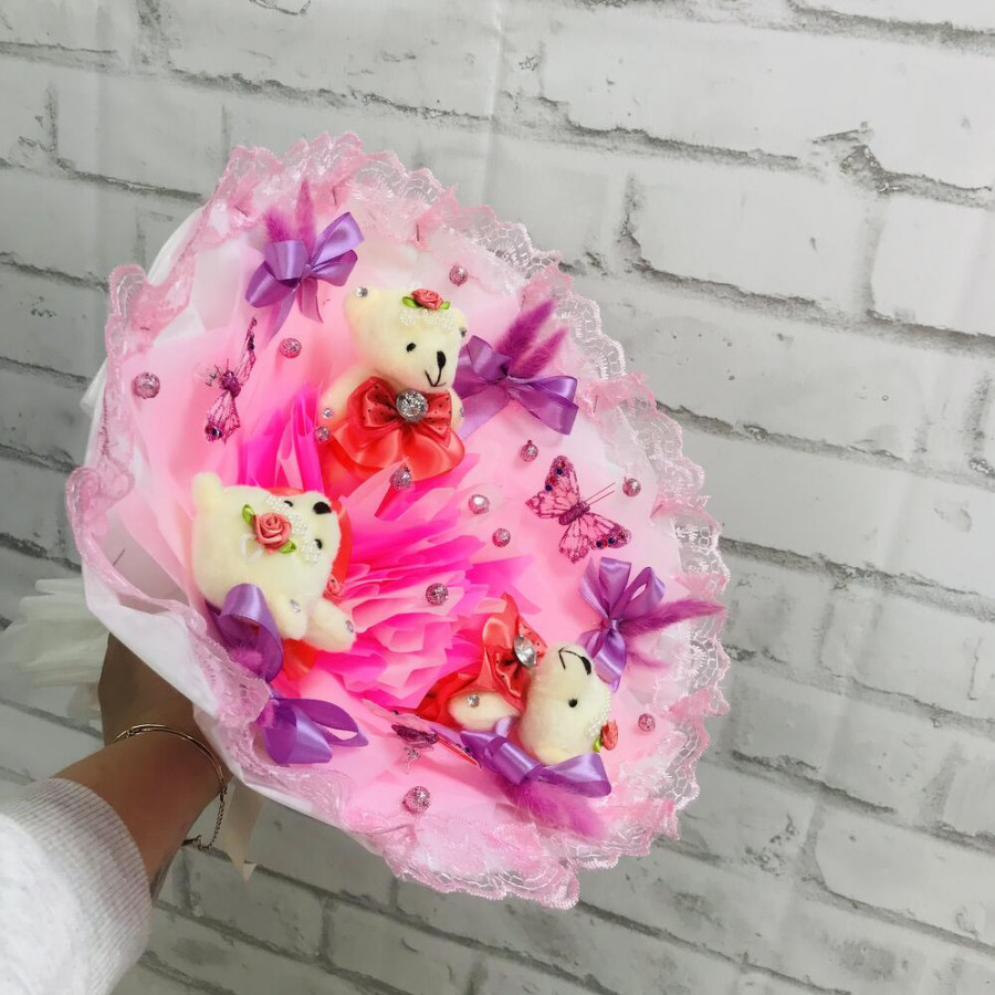 На фото букет из игрушек мишек и бабочек. В составе: . Все цветы свежие и ароматные, букет красиво оформлен и отлично подходит для подарка. Доступна доставка цветов или самовывоз.