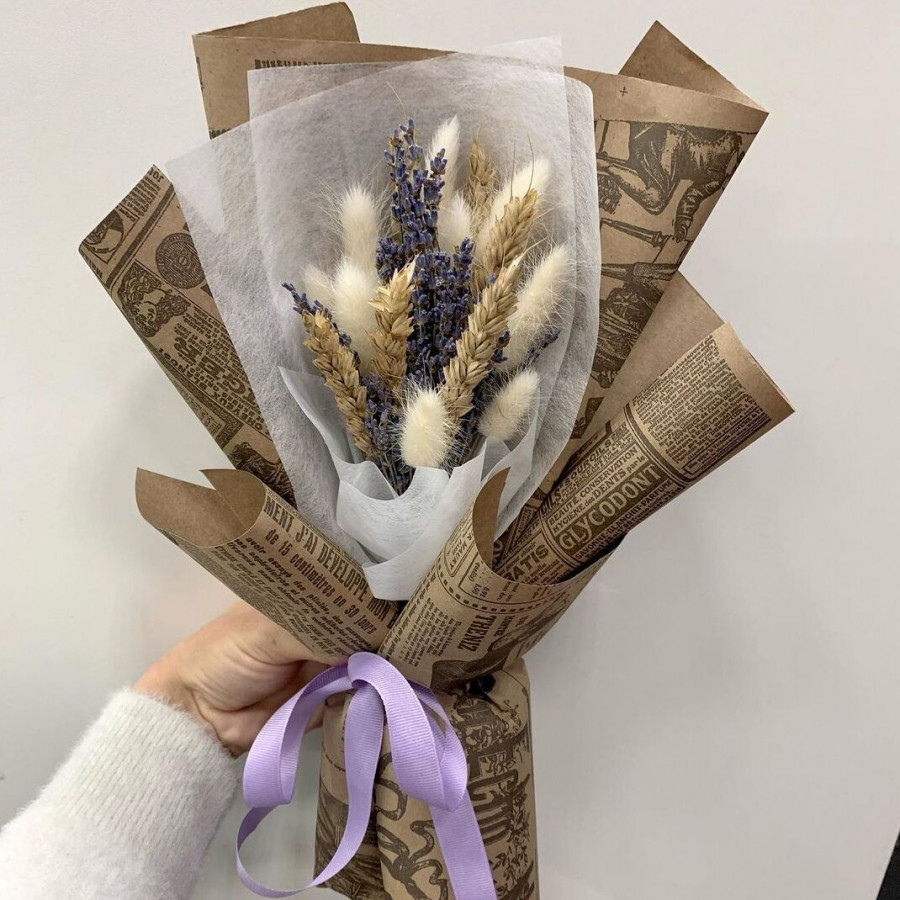 На фото букет из лаванды и колосьев. В составе: лаванда 3 шт, колосья 4 шт, крафт-бумага 1 шт, атласная лента 1 шт, . Все цветы свежие и ароматные, букет красиво оформлен и отлично подходит для подарка. Доступна доставка цветов или самовывоз.