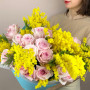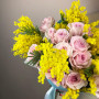 На фото букет из мимозы и розы. В составе: мимоза 10 шт, роза 25 шт, крафт-бумага 1 шт, атласная лента 1 шт, . Все цветы свежие и ароматные, букет красиво оформлен и отлично подходит для подарка. Доступна доставка цветов или самовывоз.