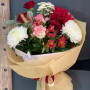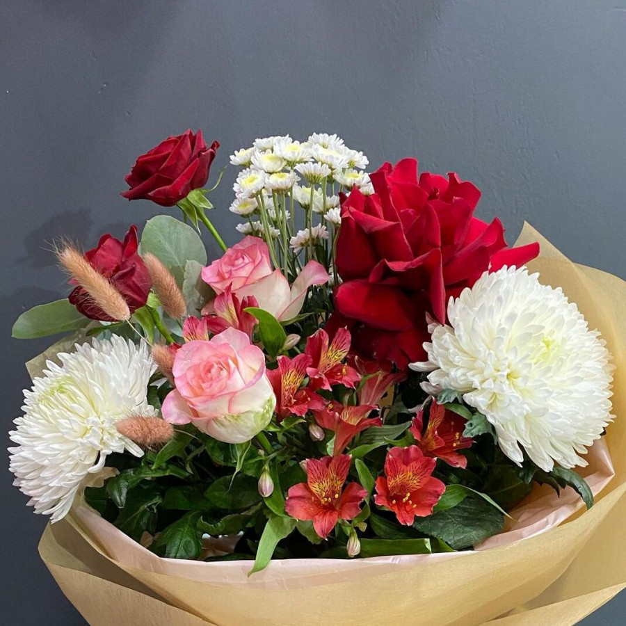 На фото букет из одноголовых хризантем и роз. В составе: хризантема одноголовая 3 шт, роза 3 шт, кустовая роза 2 шт, альстромерия 1 шт, лагурус 1 шт, крафт-бумага 0 шт, атласная лента 1 шт, . Все цветы свежие и ароматные, букет красиво оформлен и отлично подходит для подарка. Доступна доставка цветов или самовывоз.