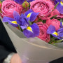 Букет из розовых пионовидных роз и синих ирисов в Брянске