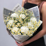 На фото букет из ромашек и гвоздик. В составе: гвоздика 7 шт, танацетум 9 шт, крафт-бумага 1 шт, атласная лента 1 шт, . Все цветы свежие и ароматные, букет красиво оформлен и отлично подходит для подарка. Доступна доставка цветов или самовывоз.