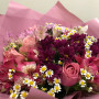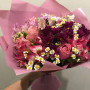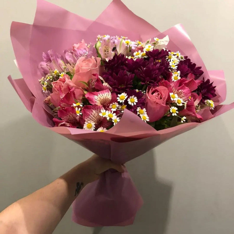 Сборный букет из альстромерий, роз, хризантем и ромашек, в матовой упаковке
