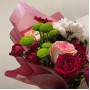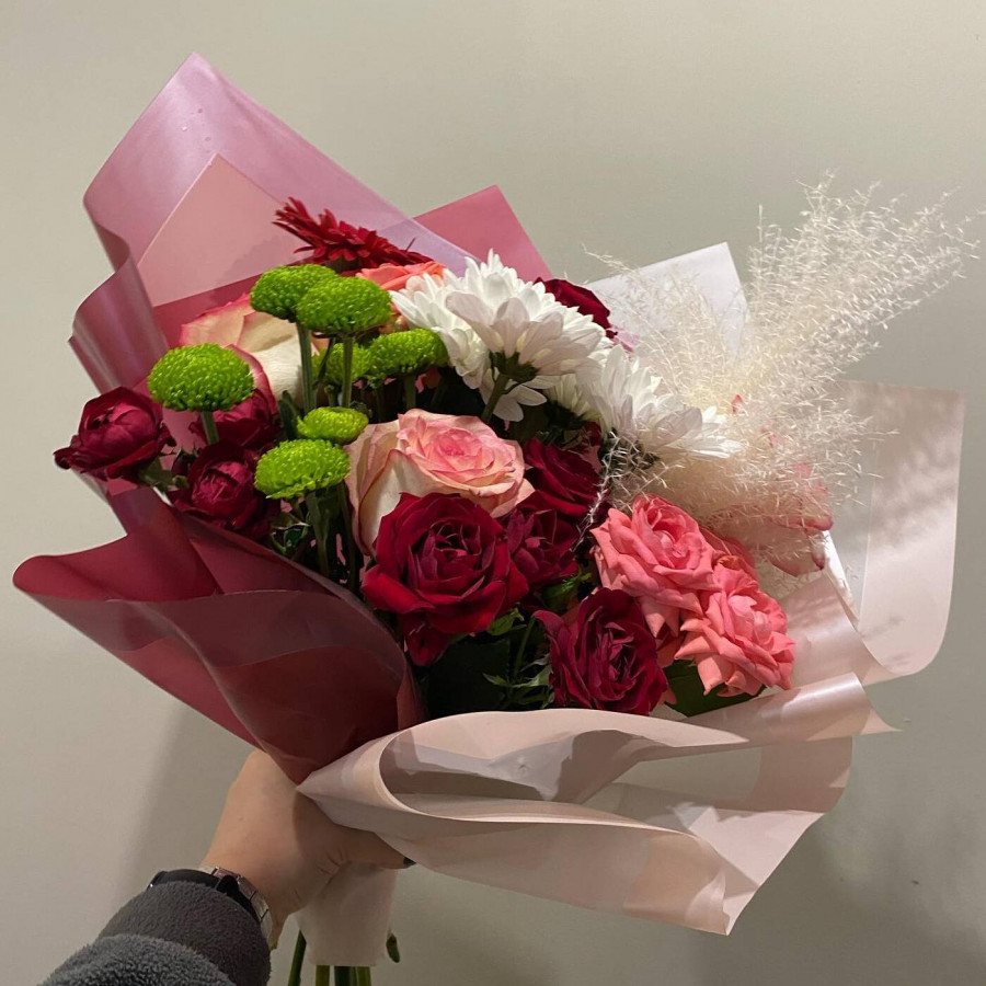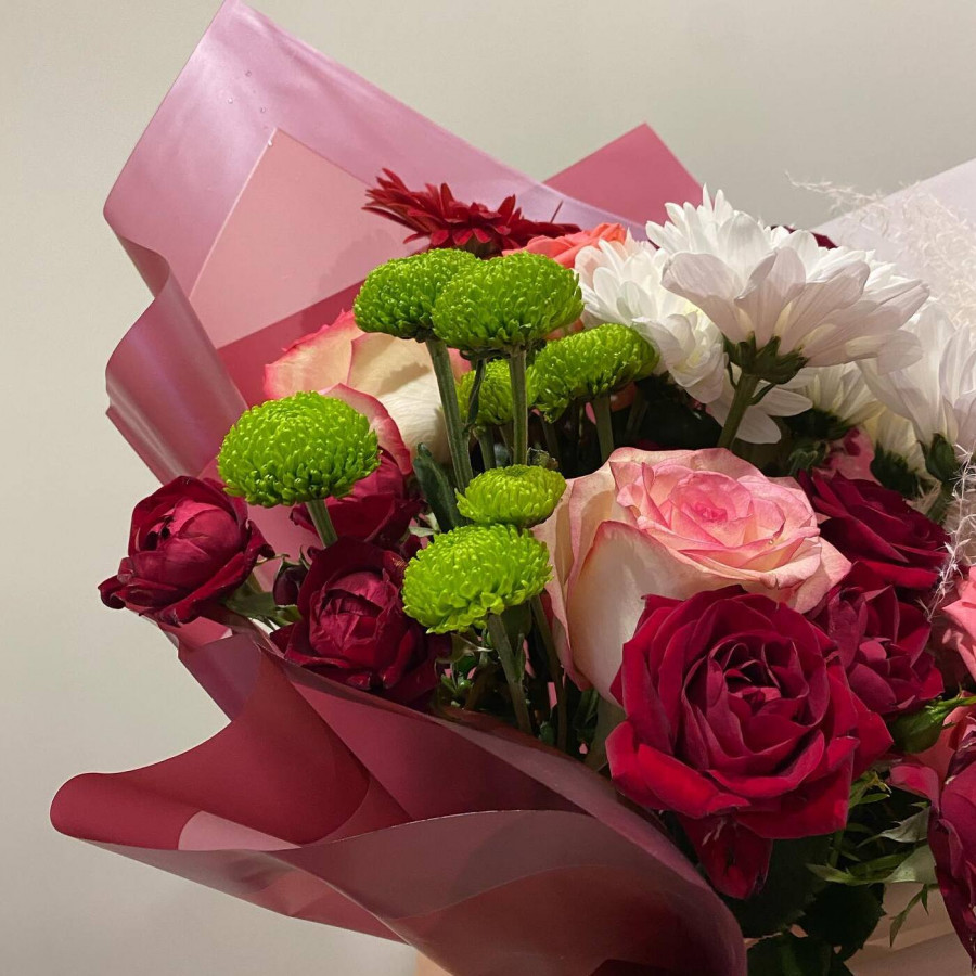 На фото букет из роз, гербер и хризантем. В составе: роза 2 шт, кустовая роза 2 шт, гербера 3 шт, крафт-бумага 1 шт, атласная лента 1 шт, . Все цветы свежие и ароматные, букет красиво оформлен и отлично подходит для подарка. Доступна доставка цветов или самовывоз.