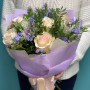 На фото букет из роз и статицы. В составе: роза 5 шт, статица 2 шт, писташ 2 шт, крафт-бумага 1 шт, атласная лента 1 шт, . Все цветы свежие и ароматные, букет красиво оформлен и отлично подходит для подарка. Доступна доставка цветов или самовывоз.