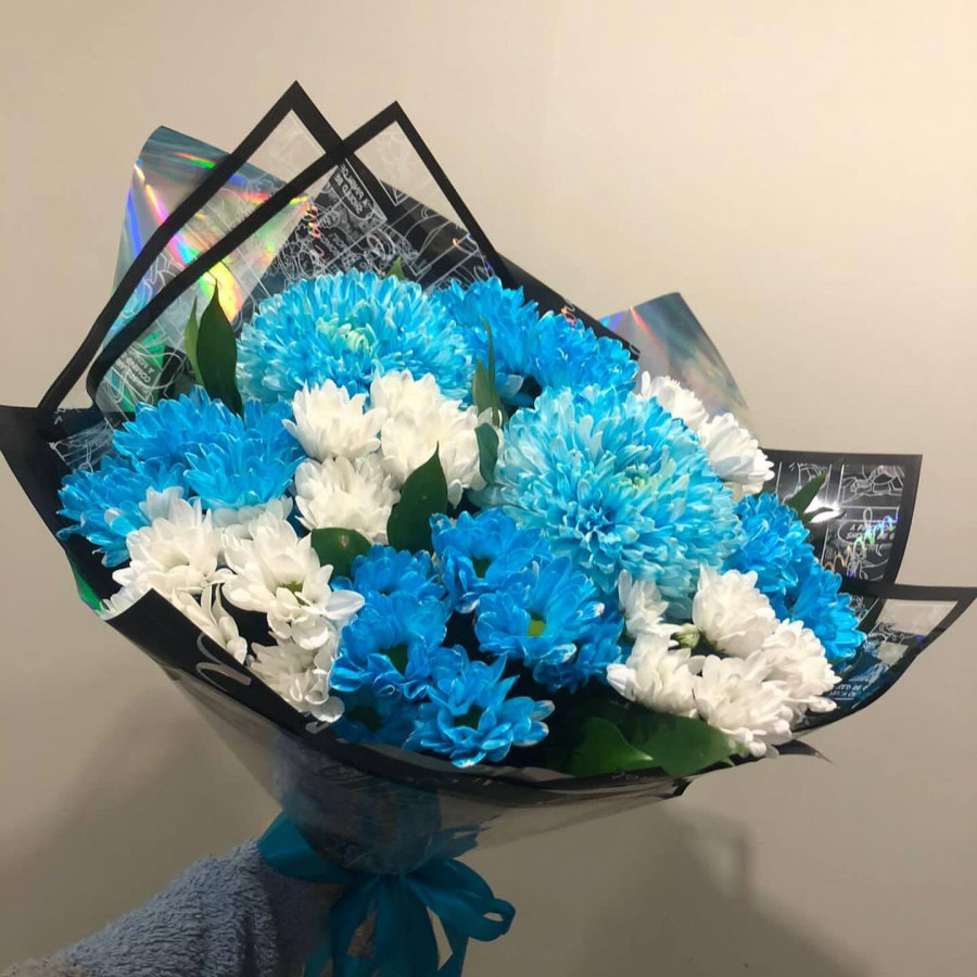 На фото букет из синих и белых хризантем. В составе: хризантема одноголовая 2 шт, хризантема кустовая 7 шт, крафт-бумага 1 шт, атласная лента 1 шт, . Все цветы свежие и ароматные, букет красиво оформлен и отлично подходит для подарка. Доступна доставка цветов или самовывоз.