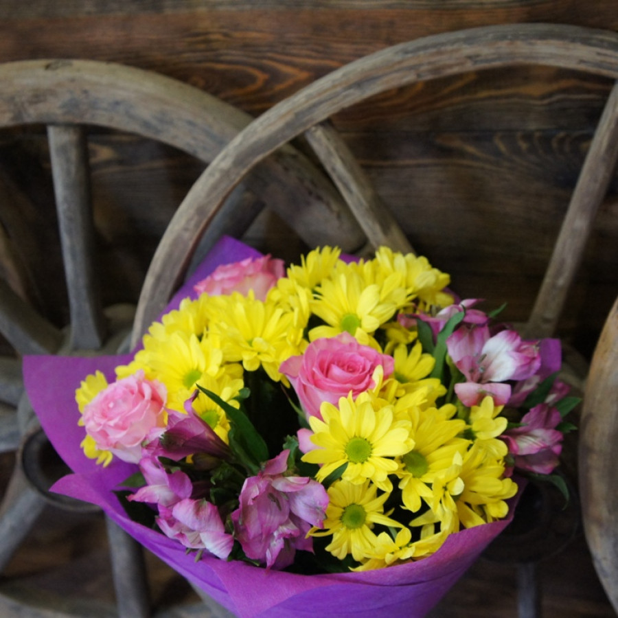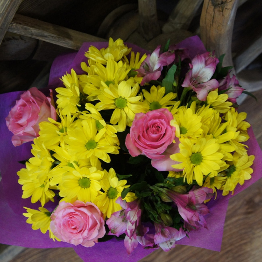 Неожиданный букет – это самый лучший подарок для каждой женщины. А композиция, собранная с любовью, состоящая из восхитительных альстромерий, изящных хризантем, элегантных роз и декорированная насыщенно зелеными листиками папоротника гарантированно вызовет бурю восторга и позитивных эмоций. Оригинальная и стильная упаковка, умеренная цена делают данный букет одним из самых популярных и очаровательных.