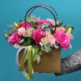 Розовые розы с альстромерией в сумочке в Брянске