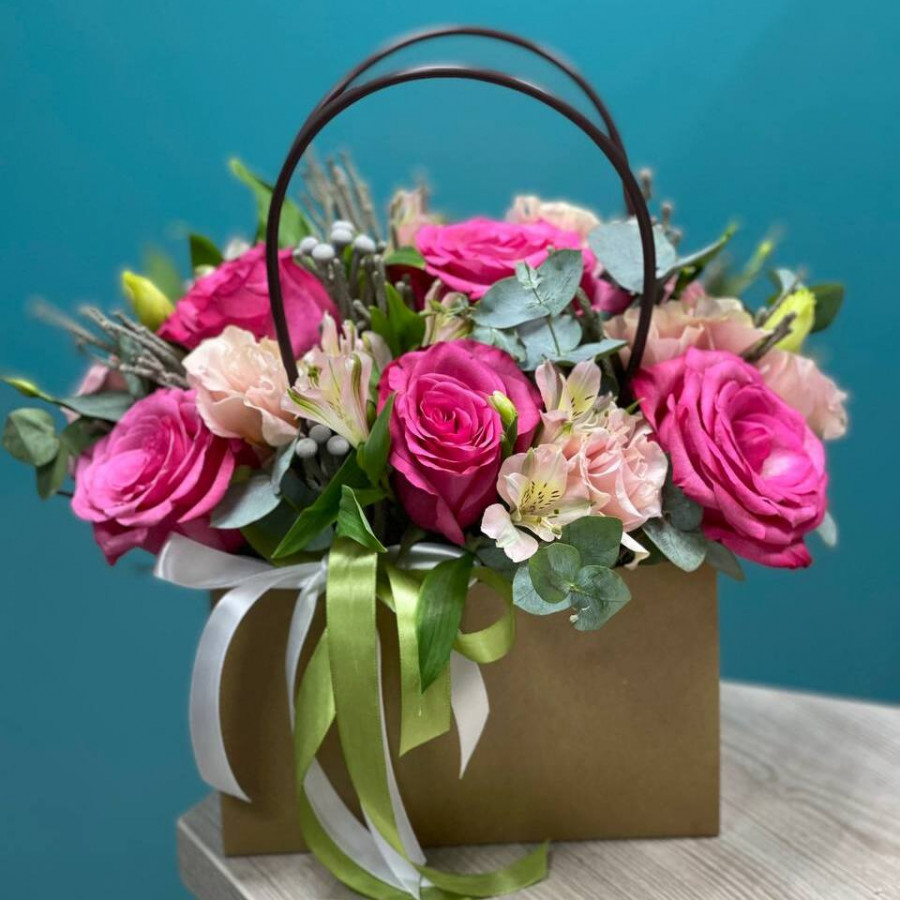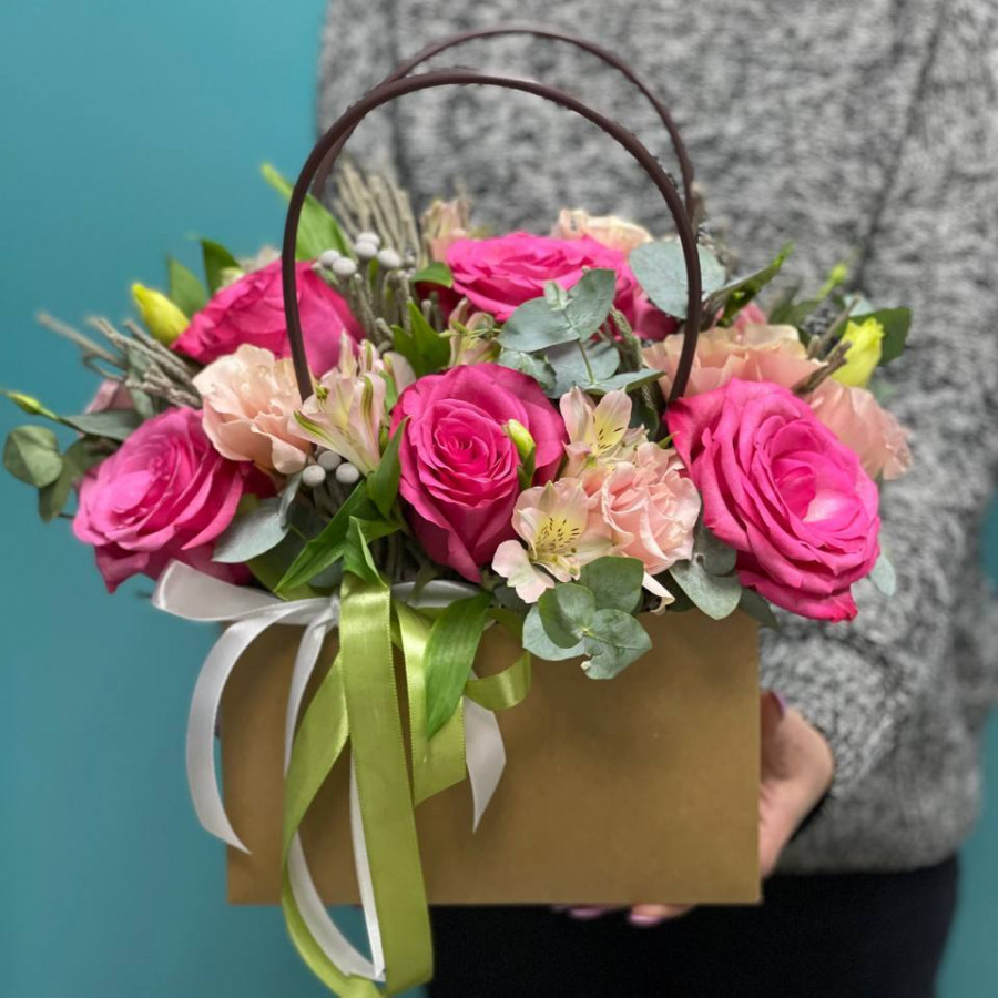 На фото розовые розы с альстромерией в сумочке. В составе: роза 5 шт, альстромерия 4 шт, эустома (лизиантус) 2 шт, альстромерия 0 шт, бруния 4 шт, эвкалипт 1 шт, . Все цветы свежие и ароматные, букет красиво оформлен и отлично подходит для подарка. Доступна доставка цветов или самовывоз.